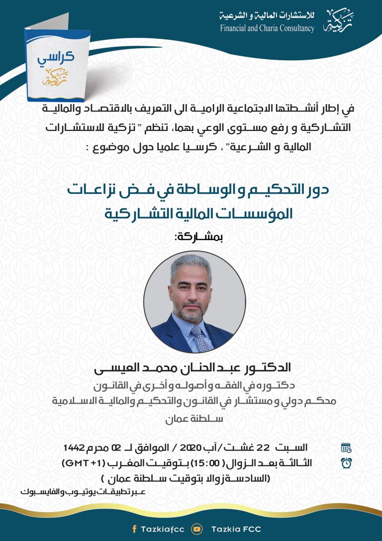 ترقبوا الكرسي الثالث من سلسلة ” كراسي تزكية ” بعنوان “دور التحكيم و الوساطة في فض نزاعات المؤسسات المالية التشاركية” يوم 22 غشت 2020، برفقة الدكتور عبد الحنان العيسى من سلطنة عمان.